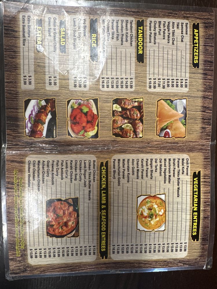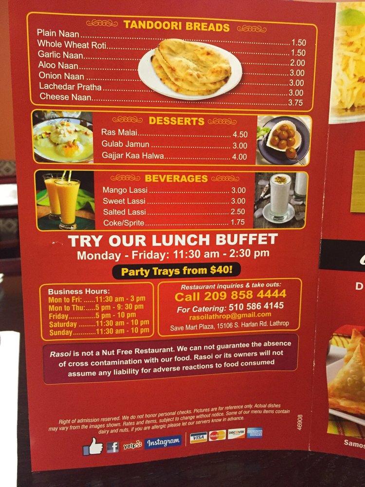 Introducing the menu at Rasoi, The Indian Kitchen, located in Lathrop, CA, a food haven offering a variety of delicious Indian cuisine options. From appetizers like fish pakora and aloo tikki chaat to vegetarian entrees like chana masala and dal makhani, every dish is packed with authentic flavors. The beverage selection includes refreshing options like mango lassi and Limca Indian soda. The restaurant also caters to various dietary preferences, with vegan and vegetarian options available. Whether you're dining in or taking out, Rasoi provides a welcoming atmosphere with amenities like free Wi-Fi, outdoor seating, and waiter service. Get ready to indulge in a culinary journey through India at Rasoi, where every bite is a celebration of traditional Indian flavors.